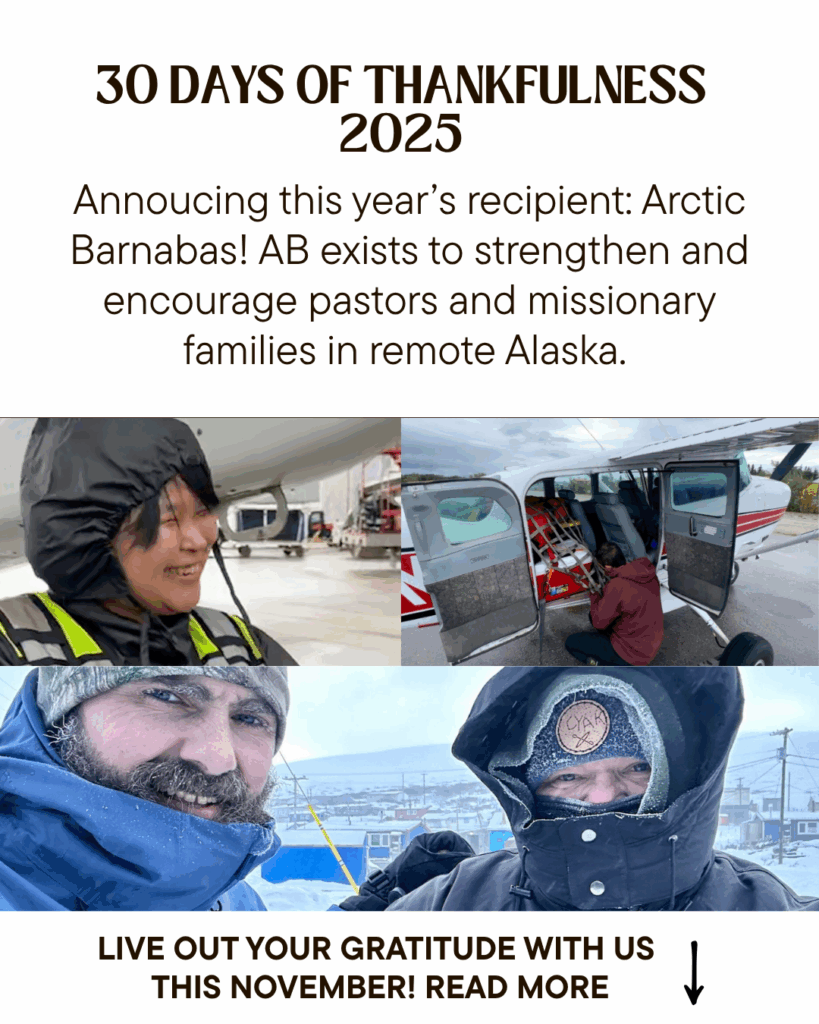 The recipient of this year’s drive is Arctic Barnabas of Kenai, Alaska. You may remember I traveled to Alaska this past April to speak to the AB staff and fell in love with their mission! Arctic Barnabas exists to strengthen and encourage pastors and missionary families in remote Alaska. Fuel costs to minister to remote bush communities that can only be reached by plane and boat are incredibly costly. Let’s help! I have a benefactor willing to match our efforts. My goal is $5,000, and we can do it! All gifts help whether you can give $5 or $500! Give and we’ll trust the Lord for the increase.