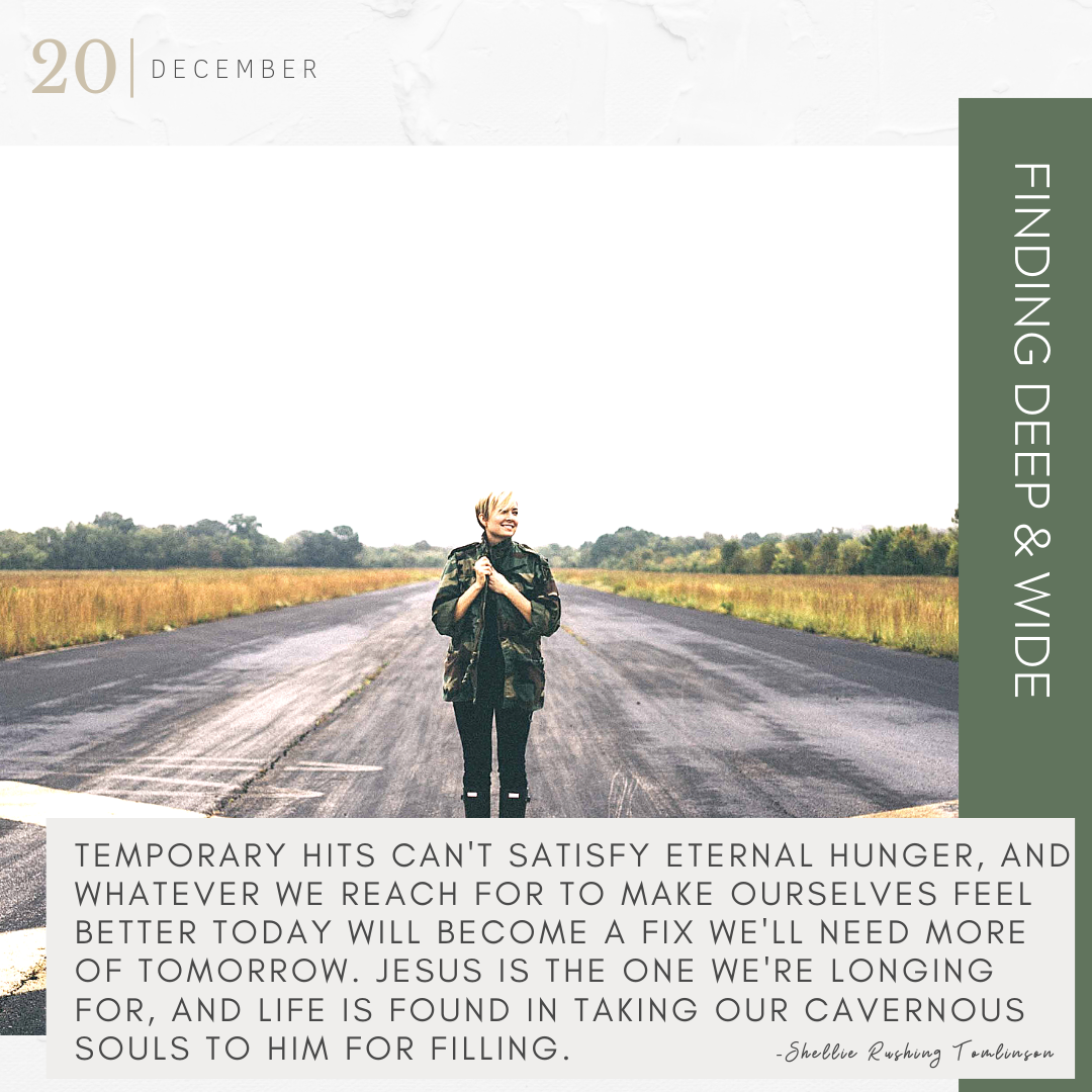 [bctt tweet=”Temporary hits can’t satisfy eternal hunger, and whatever we reach for to make ourselves feel better today will become a fix we’ll need more of tomorrow. Jesus is the One we’re longing for, and life is found in taking our cavernous souls to Him for filling. #findingdeepandwide” username=”shelliet”]