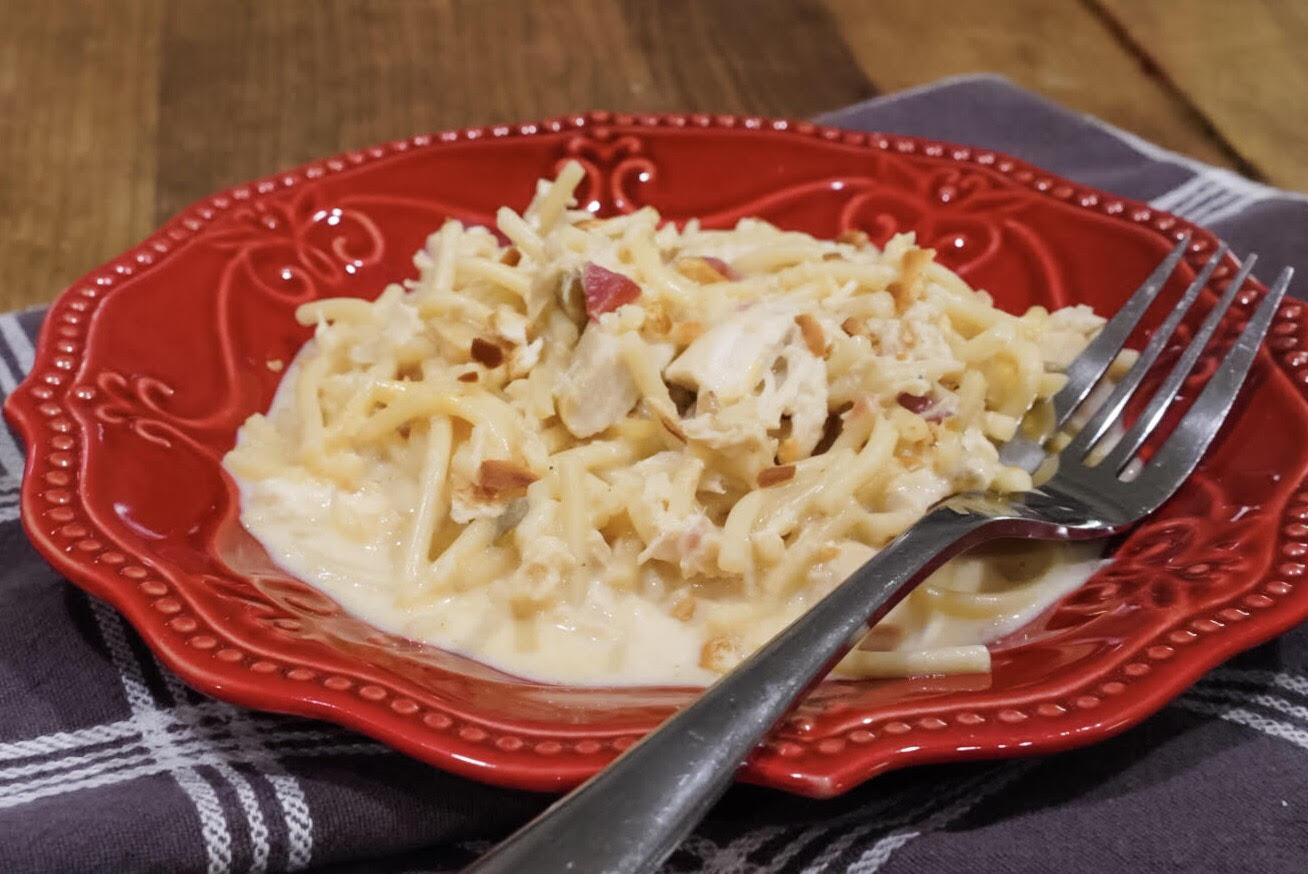 Take a cast iron skillet and sauté a chopped onion in a stick of butter. Once the onions are clear, add chopped mushrooms and continue to cook until mushrooms shrink. Add onions, mushrooms, and shredded chicken to spaghetti. Season with salt and pepper. If the spaghetti is too thick, add milk to preferred consistency. Enjoy!